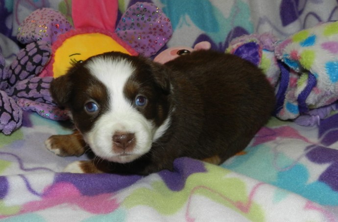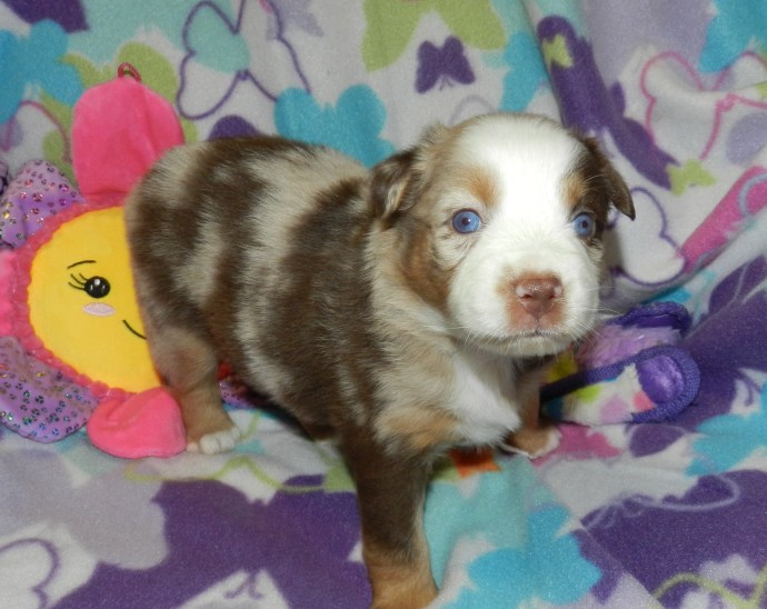 Gidget and Elvis welcomed 5 adorable pups 7 weeks ago, with Gidget tracing back to the original Mini Aussies from 20 years ago. Lacy and Rusty. After dedicated work on their temperament, the pups are now ASDR reg. and will be ready for new homes on 7/24. Call for more information.